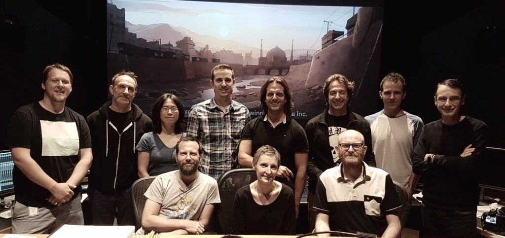 Great mixing session at Technicolor Toronto for The Breadwinner. Back row (left to right): Tyler Whitham (sound editor), Mychael Danna (film composer), Julie Soebekti (Post Production Supervisor), J.R. Fountain (sound designer / re-recording mixer / supervising sound editor), Anthony Leo (Producer), Jeff Danna (composer), Erich Stratmann (music editor), Frank Morrone (re-recording mixer). Front row (left…